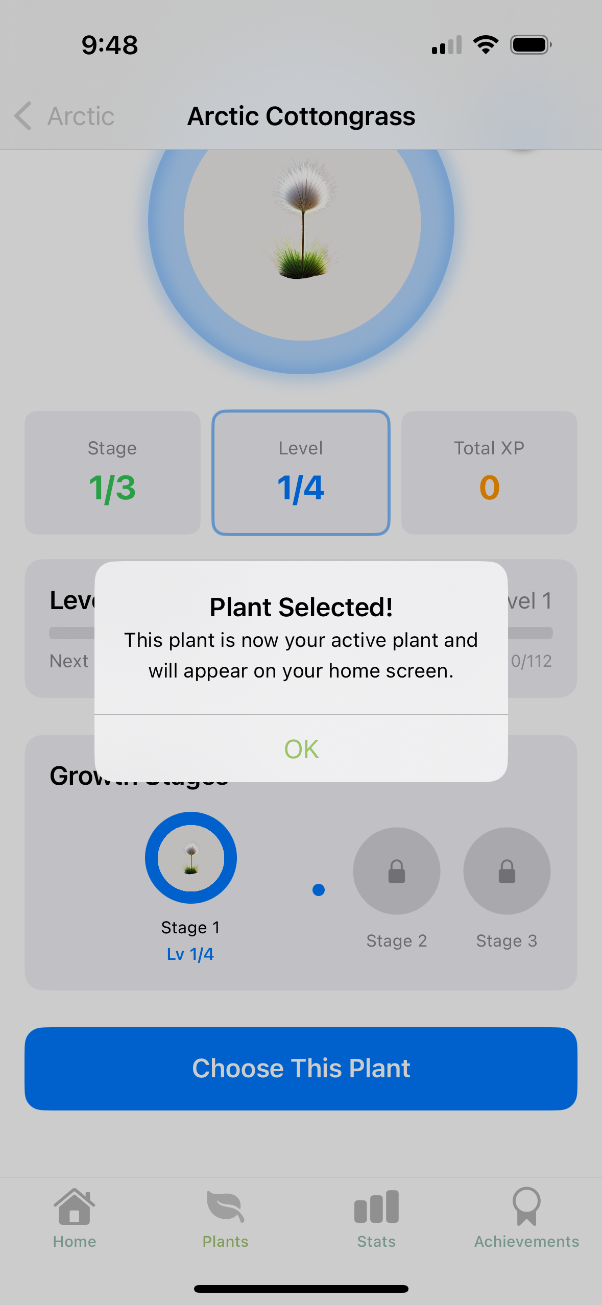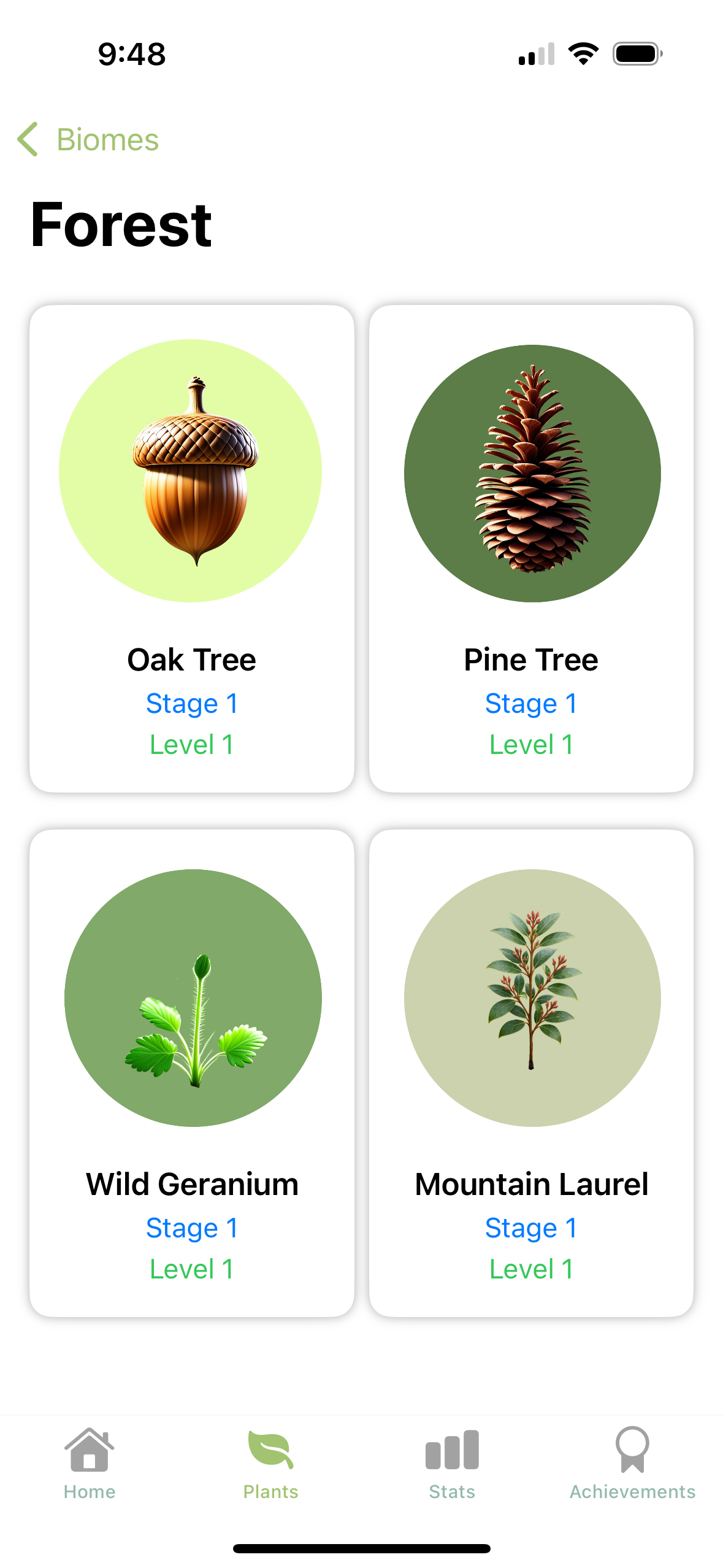 Your healthy choices bring beautiful plants to life across different biomes and stages. Each plant has 3-4 stages you unlock with your movement and healthy living.