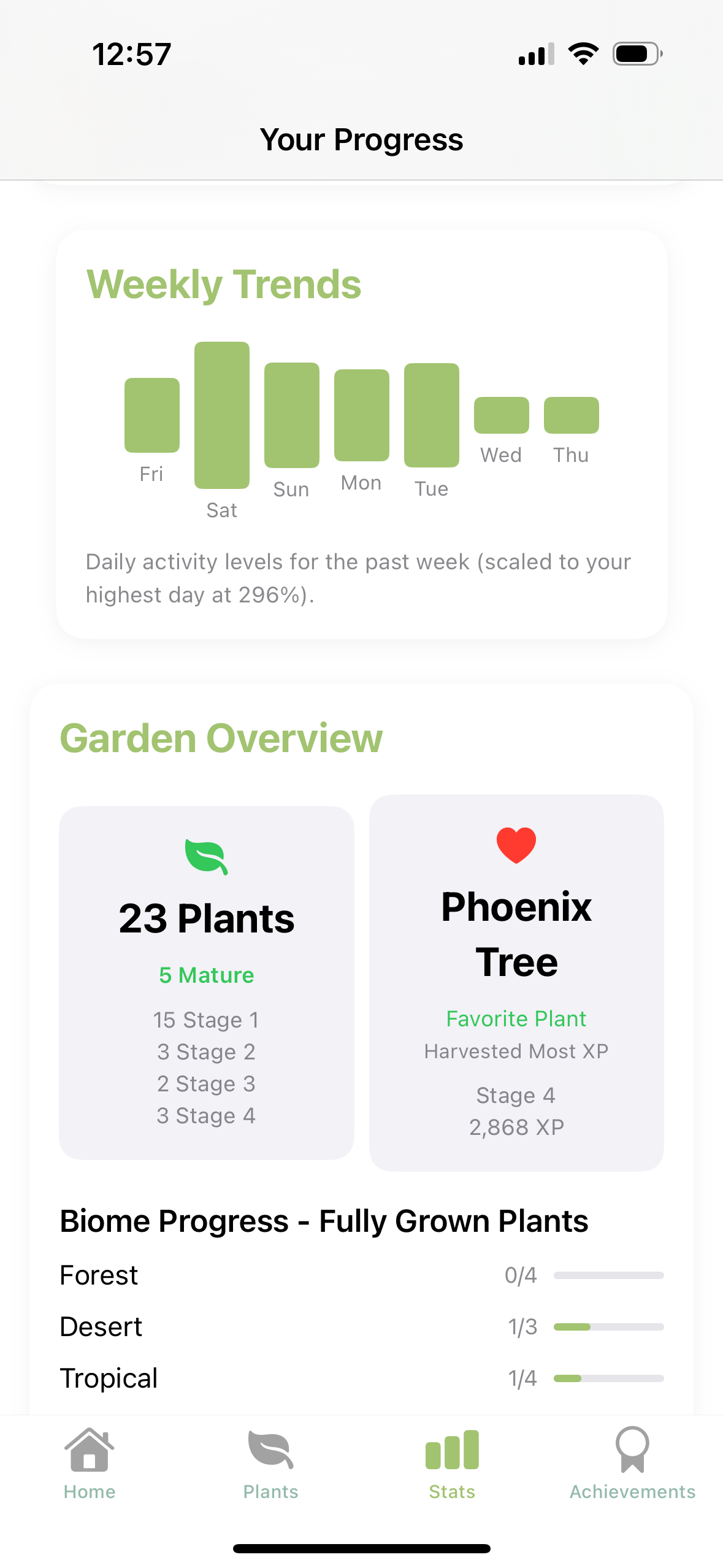 Choose from dozens of beautiful plants across six unique biomes. Watch them evolve through multiple growth stages as you stay active and take care of yourself.